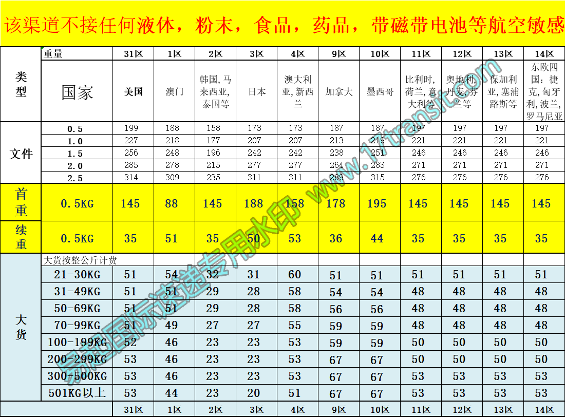 類型 | 重量 | 31區(qū) | 1區(qū) | 2區(qū) | 3區(qū) | 4區(qū) | 5區(qū) | 6區(qū) | 7區(qū) | 8區(qū) | 9區(qū) | 10區(qū) | 11區(qū) | 12區(qū) | 13區(qū) | 14區(qū) |