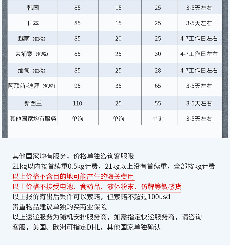 聲明:本文內(nèi)容旨在提供關(guān)于國際速遞服務(wù)的通用信息。文中涉及的價(jià)格、時(shí)效、服務(wù)內(nèi)容等因素受實(shí)際海關(guān)政策、季節(jié)變化、產(chǎn)品性質(zhì)、倉位、國際行情市場波動(dòng)等不可控情況影響較大,因此涉及價(jià)格、服務(wù)、資質(zhì)說明及案例等內(nèi)容不作為價(jià)格憑證或合同約定,僅供參考。