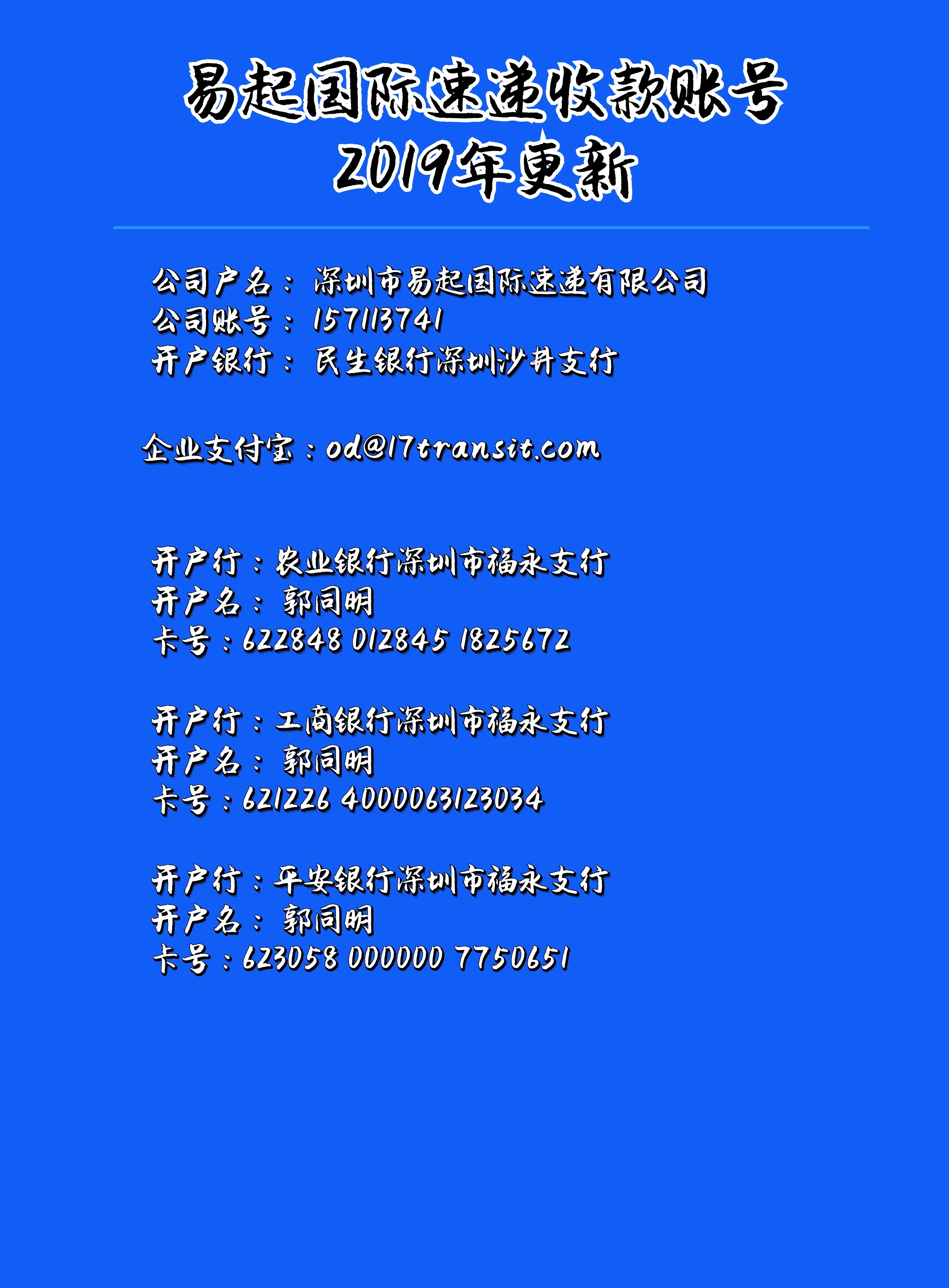 以上是關(guān)于易起國際速遞付款賬號的全部內(nèi)容,如果您想要了解更多關(guān)于易起國際速遞付款賬號內(nèi)容,請聯(lián)系我們易起國際速遞咨詢